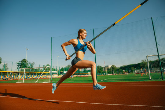Professional female pole vaulter training at the stadium in sunny day. Fit female model practicing in high jumps outdoors. Concept of sport, activity, healthy lifestyle, action, movement, motion.