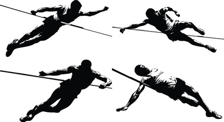 Dynamic female pole vaulter silhouette clearing the bar. Track and field athlete in action, high jump illustration.