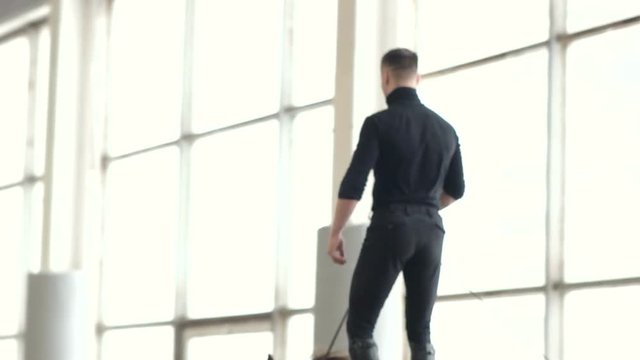 A man riding a brown horse around the arena. Man fulfills tricks on horseback. Vaulting. Trick riding. Riding standing on horse. Close up.