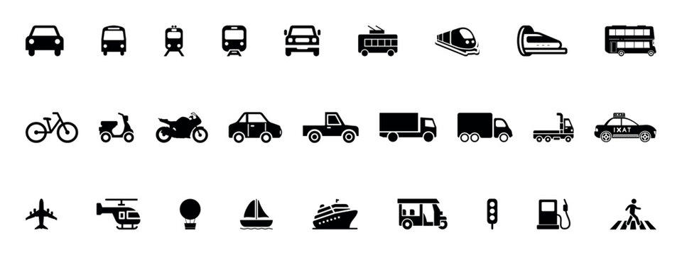 Transportation, vehicle icon set. Glyph pictograms of travel, logistics, public transit concepts, car, train, bus, bicycle, boat, ship, and airplane black silhouette vector illustration.