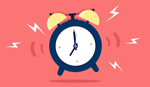 Alarm clock ringing - Loud annoying morning wake up clock at 7 am. Flat design vector illustration on red background