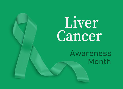 Liver Cancer Awareness Month. Realistic emerald green ribbon highlighted on a green background. A template for the design of banners, flyers and backgrounds. Vector illustration.
