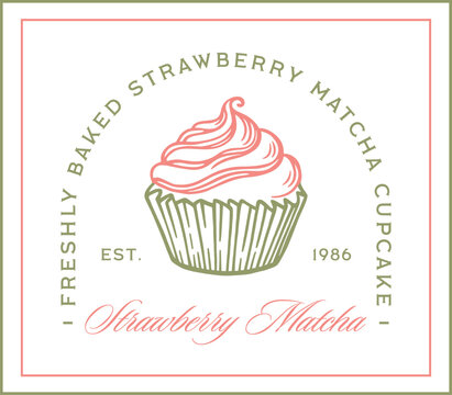 Strawberry matcha cupcake freshly baked Japanese pastry lovers green tea and fruit flavor aesthetic logo sticker label. Fancy organic natural vegan cake pink dessert retro design frame illustration.