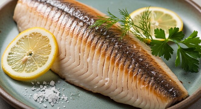 A plant-based seafood alternative resembling a fish fillet, garnished with lemon slices and herbs on a green plate. Ideal for vegan diets and ocean-friendly protein options.