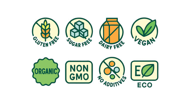 colored vector illustration icon 8 safety or eco labels flat fills with outlines gluten free sugar free dairy free vegan mark organic label non gmo no additives eco leaf isolated on white