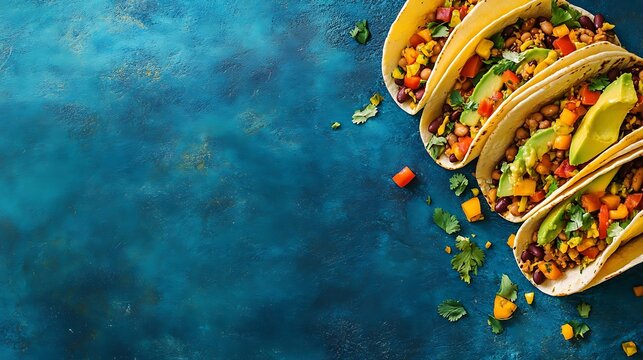 Vibrant vegan tacos filled with avocado, beans, and salsa on a blue surface. Extra space for adding text for advertising purposes.