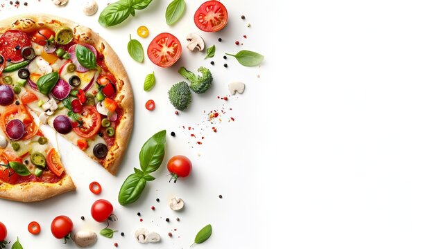Manipulation food concept of a whimsical vegetable pizza, designed in a food on white background style, banner sharpen with copy space for advertise