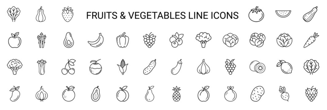 fruits vegetables line art themed icon collection