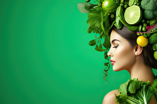Green background of a woman with vegetables in her hair, banner voor vegan day or vegetarian week