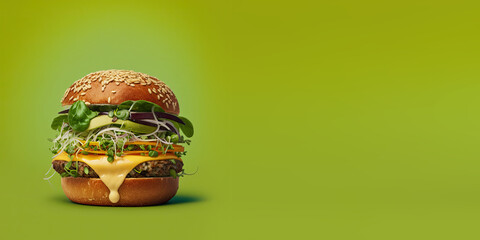 Vegetarian Burger on a Green Background with Space for Copy (Generative AI)