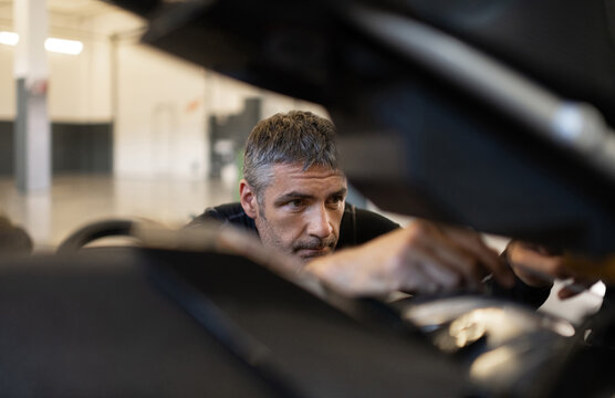 Mature male mechanic fixing motorcycle