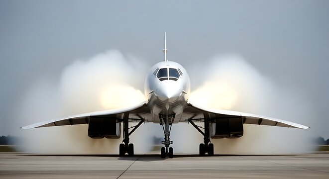 Dramatic front view of a Concorde supersonic airliner taking off with engine smoke