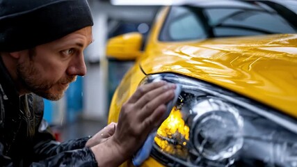Skilled worker applying compound on a yellowed headlight on an overcast day improving visibility and vehicle aesthetics.