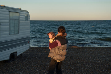 Mother Carrying Child by the Beach at Sunset Near a Camper
