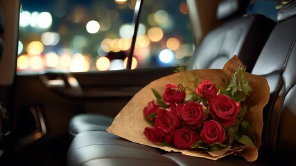 Red roses in car window blurred lights background