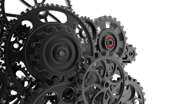 Mechanism black gears and cogs at work on spot light background. Industrial machinery. 3D illustration. 3D high quality rendering. PNG file format.