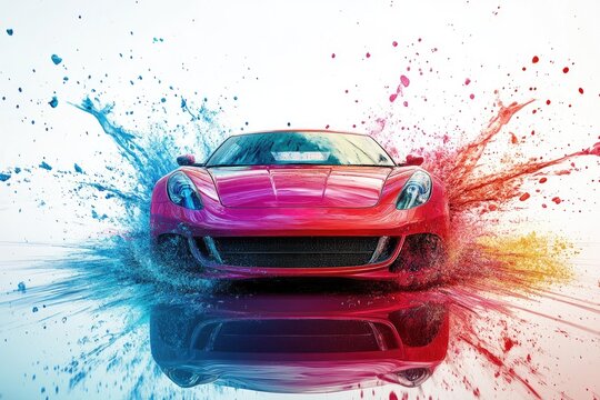 Abstract art of a classic red convertible car and motorcycle on a colorful background.