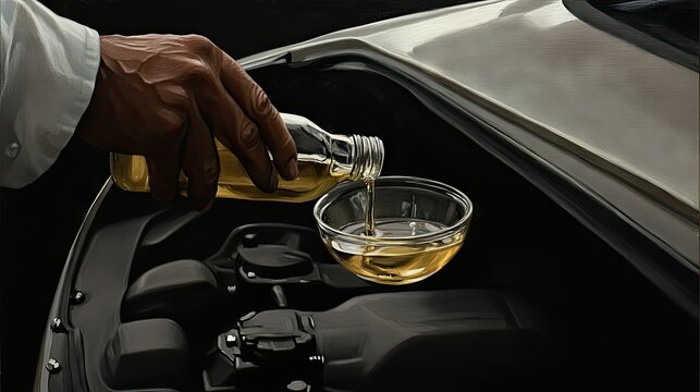Person pouring golden liquid into a bowl placed on the engine of a vehicle in a maintenance setting during daylight hours