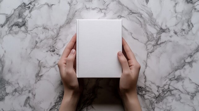 An 8K resolution, photorealistic image of hands gently supporting a plain white book against a background of richly veined marble