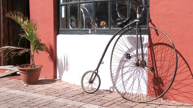 Old velocipede standing beside traditional building in small town of Saint George, Bermuda.