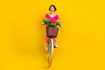 Full length photo of impressed ecstatic woman wear pink knit top trousers riding bicycle with flower isolated on yellow color background