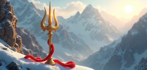 Golden trident of Shiva illustration stands in snow against mountains. Spiritual symbol design shows Hinduism tradition. Religious banner greeting card, backdrop with devotion. Trident art for India
