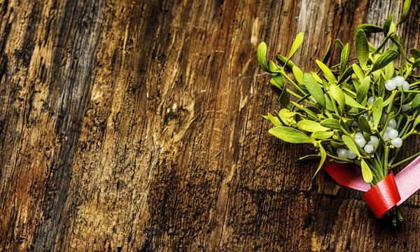 Branch of Mistletoe with ribbon on wooden background.