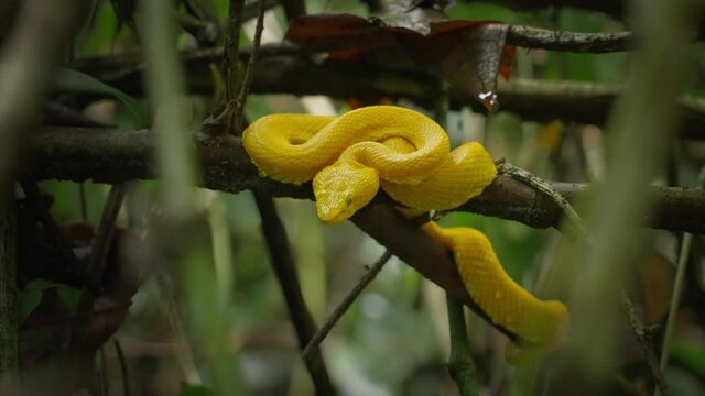 Yellow snake eyelash pit viper sitting on branch, Costa Rica
