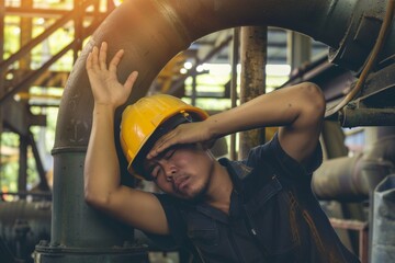 Exhausted engineer struggling with fatigue amidst challenging conditions in a hot, poorly ventilated factory environment