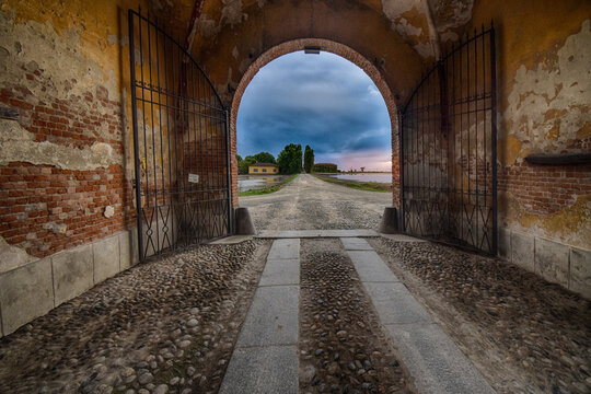 Rice fields seen from the farmhouse, Livorno Ferraris, Vercelli, Piedmont, Italy.