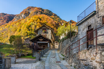 The beautiful village of Rassa, during fall season, in Valsesia (Sesia Valley). Province of Vercelli, Piedmont, Italy.