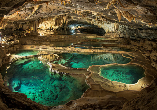 Crystal clear water pools reflect the cave ceiling in the grottes de Choranche, showcasing the natural beauty and geological formations of the French Vercors, creating a serene atmosphere.