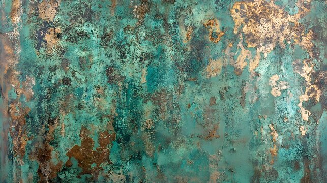 Metallic background with a distressed copper texture, featuring natural verdigris patina, evoking an antique, rustic aesthetic, ideal for historical or steampunk designs.