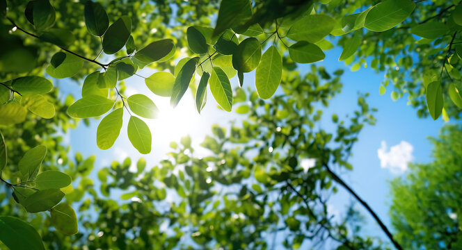 Captivating midsummer sunlight filtering through lush green foliage. Sun rays streaming through an opening of leaves.