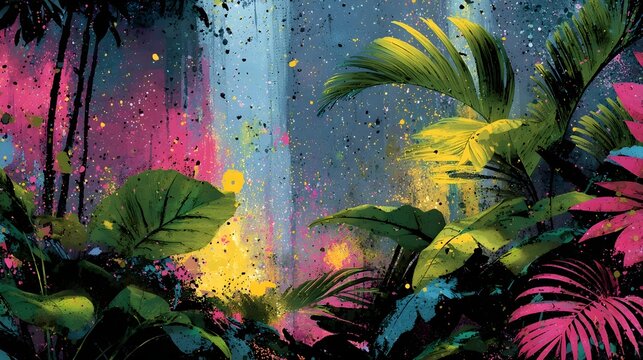 Lush and vibrant tropical jungle foliage with colorful splatter and abstract elements creating a surreal and immersive natural environment