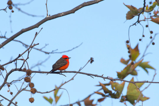 Vermilion fly catcher on a branch. It is a favorite with birders, but is not generally kept in aviculture, as the males tend to lose their vermilion coloration when in captivity..