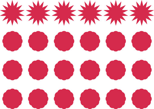 A versatile graphic set of red starburst and scalloped circle seal shapes for promotional stickers and emblems