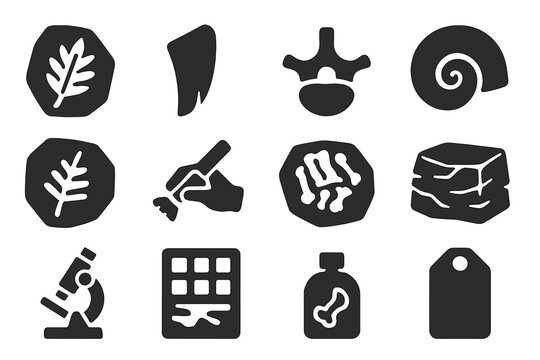 Fossil Study Icons. Solid style icons of Fossil study: fossilized leaf, dinosaur tooth, vertebra fragment, ammonite shell, fossil