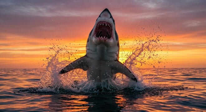 Great white shark leaps from the ocean at sunset, mouth open, water splashing around it.