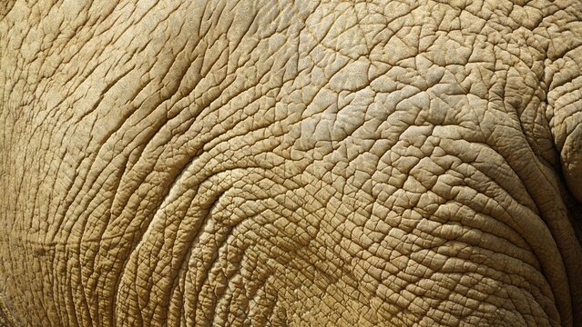 Close up image of an African elephant's skin. Background safari animal texture with copy space. Wrinkled, leathery dry texture with deep cracks and crevices. Looks like a rock face or dry wilderness.