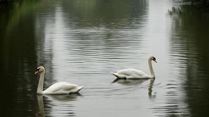 Realistic Video Of Two White Swans Swimming On A Calm Lake Surface