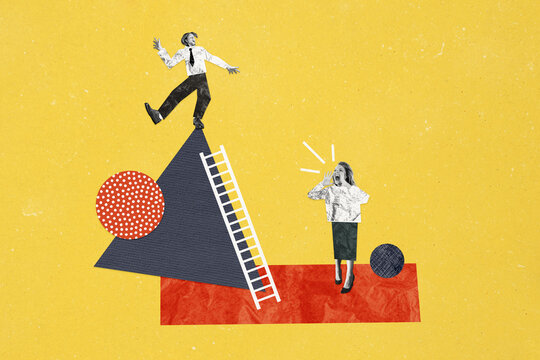Composite photo collage of angry bossy girl scream lazy guy climb vertex promotion concept career ladder isolated on painted background