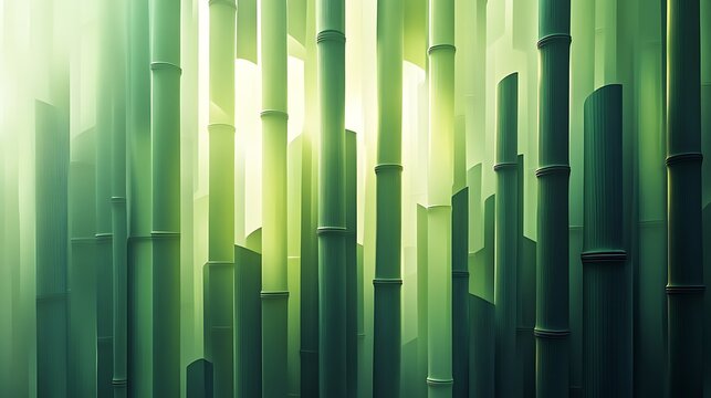 Bamboo shoots arranged in a repetitive minimalist pattern, vertical alignment with soft green hues and subtle glowing gradients, textured details creating depth, serene and refined design, hd quality.
