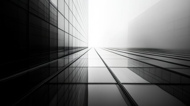 Modern high-rise office building with seamless glass panels, low-angle perspective showcasing its imposing verticality and urban elegance.