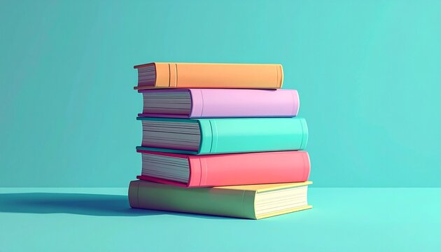 Stack of seven colorful hardcover books arranged vertically on turquoise background evoking education, creativity, and visual order