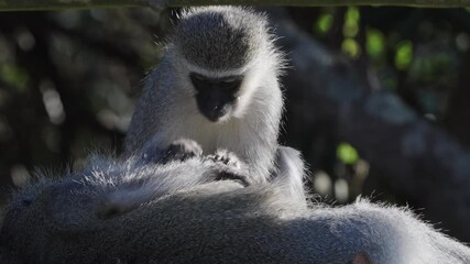 portrait of a vervet monkey and her baby, lake mburo national park, uganda, walking safari