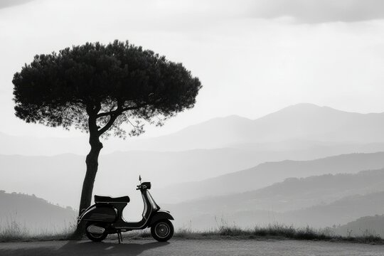 A vintage scooter parked under a tree overlooking rolling hills, captured in a serene black and white landscape with soft lighting.
