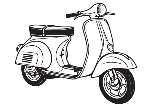 Minimalist vector artwork of a classic vintage scooter, drawn in black and white with solid black outlines, ideal for nostalgic themed graphic projects.