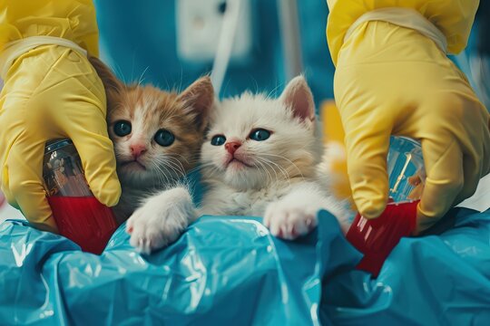 Two kittens in veterinarian's hands with gloves, with IV drips and blood. Blood donation, blood transfusion for animals, emergency veterinary, treatment and diagnosis of cats and dogs.