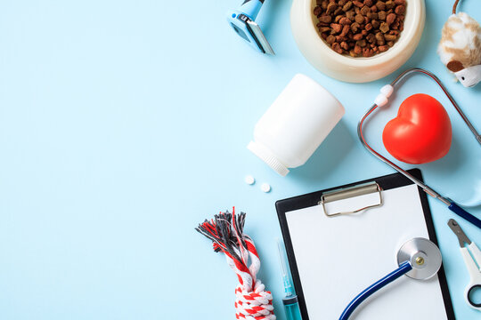 Flat lay veterinary clinic supplies and pet toys on blue background. Vet clinic banner design.
